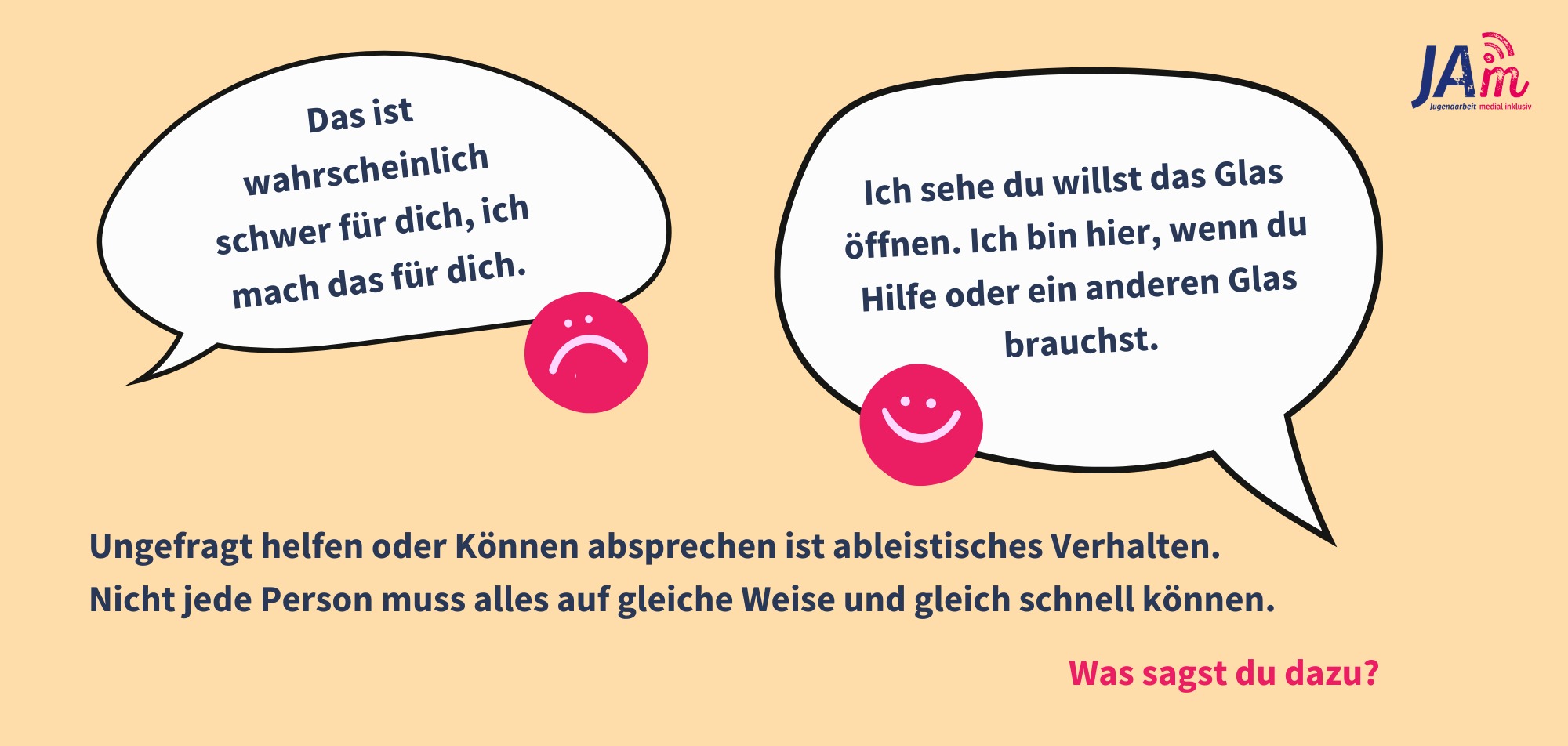 Hier erwarten dich Gesprächsanstöße und Methoden, wenn Ableismus passiert und du nur wenig Raum hast, dies zu besprechen. Ableismus bezeichnet diskriminierende und ausgrenzende Handlungen, Einstellungen und Vorurteile gegenüber Menschen mit Behinderung.
